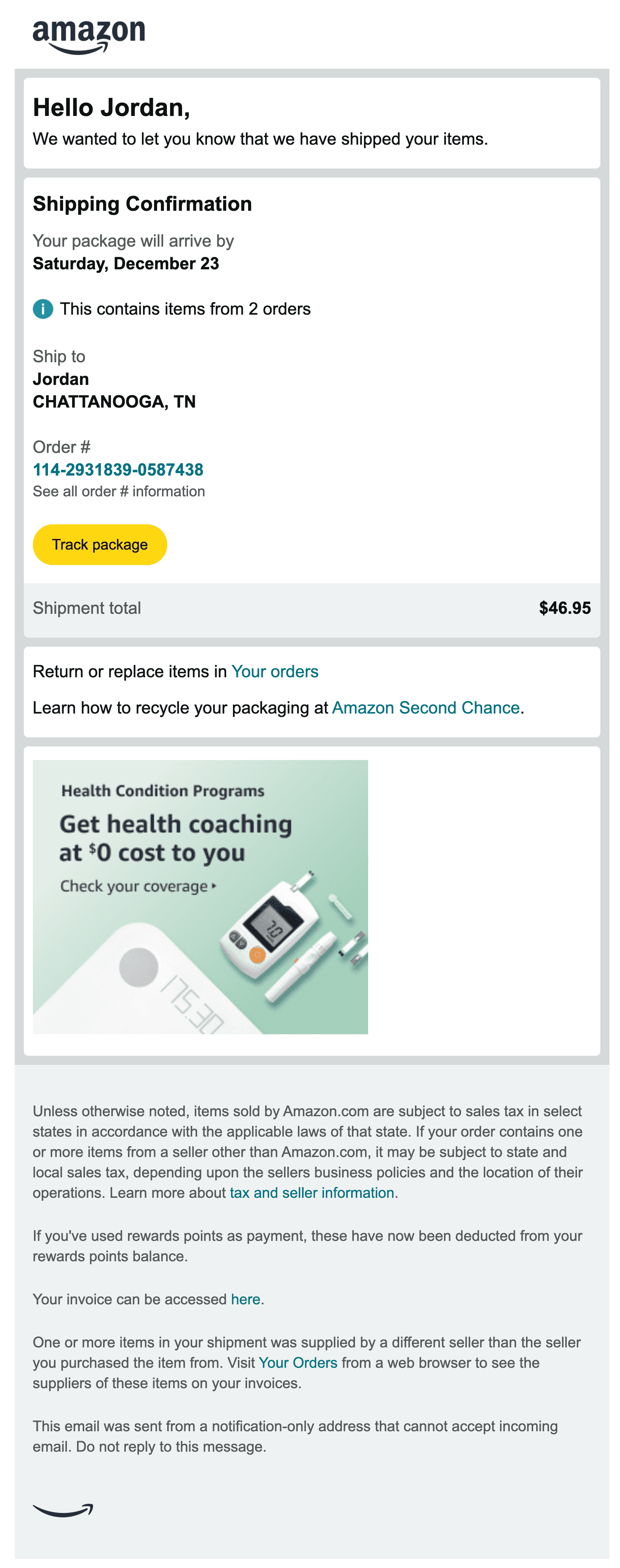 As an example, consider how Amazon cross promotes their Health Program on their recently redesigned (and highly engaged with) 'order shipped' email: