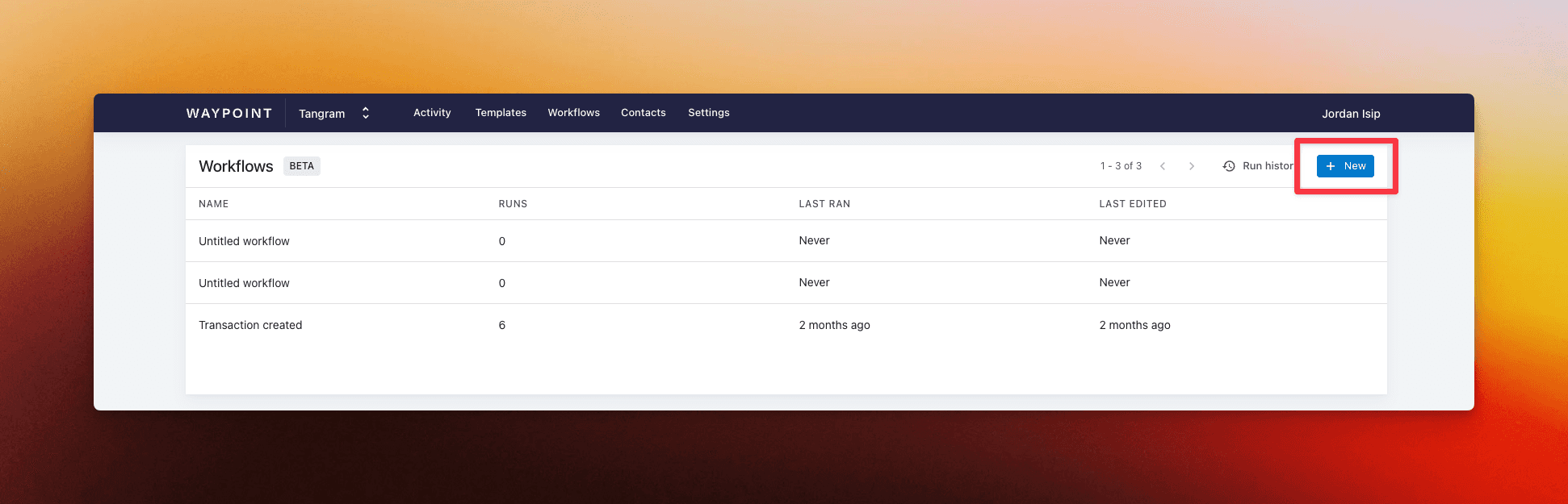 From your workspace dashboard, click on "Workflows" and then "New":