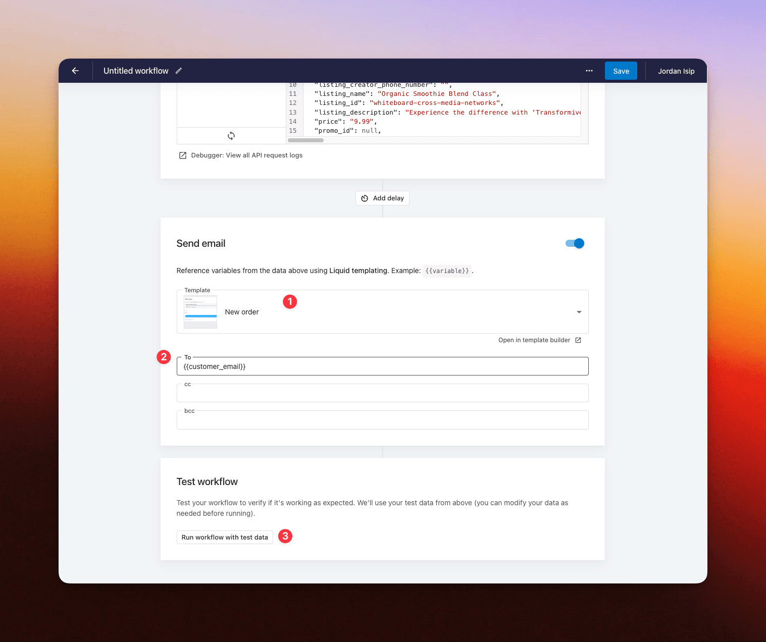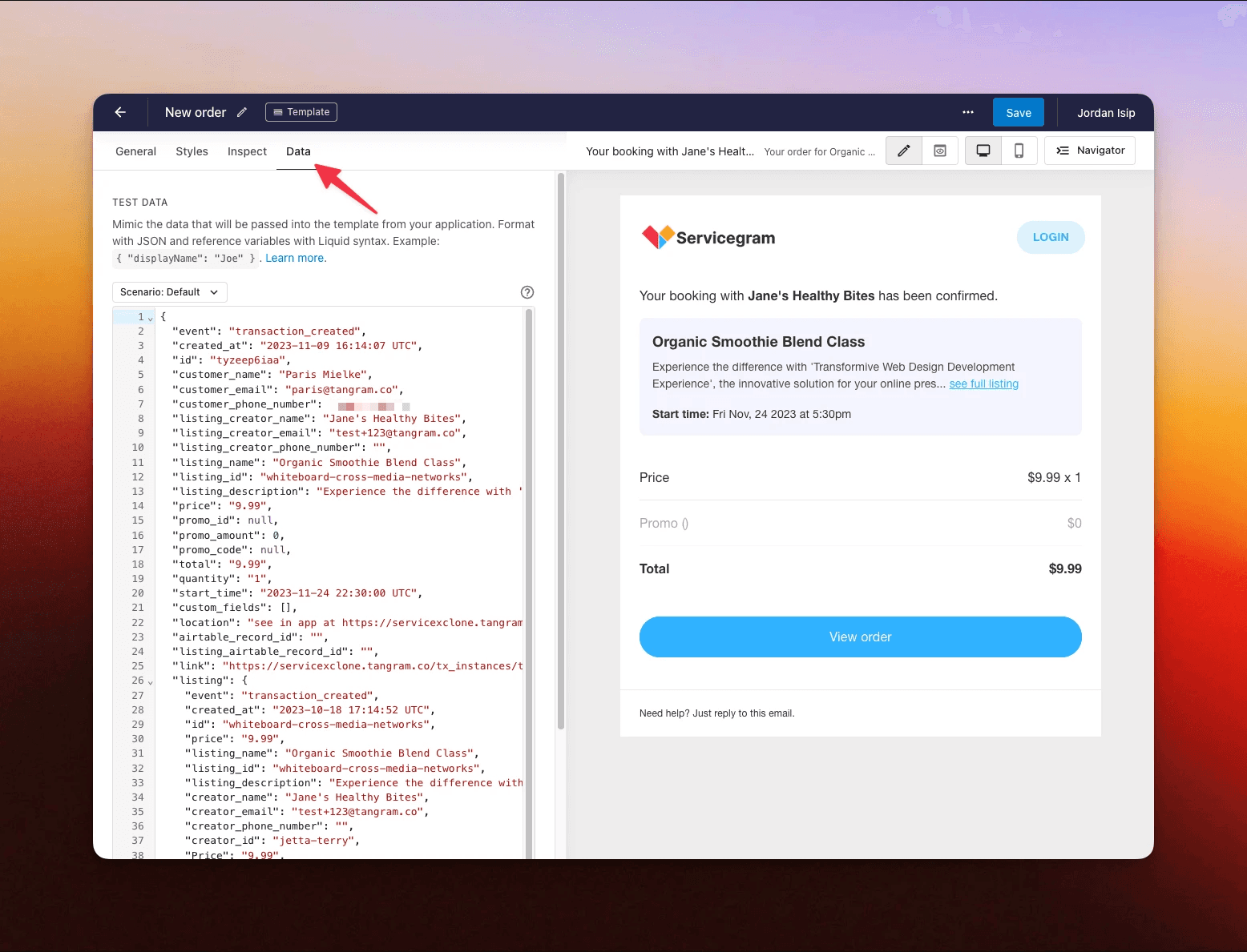 Now that we have a a test data payload to work with within our workflow, let's copy and paste this into the 'Data' tab on our template that we created in Step 1.