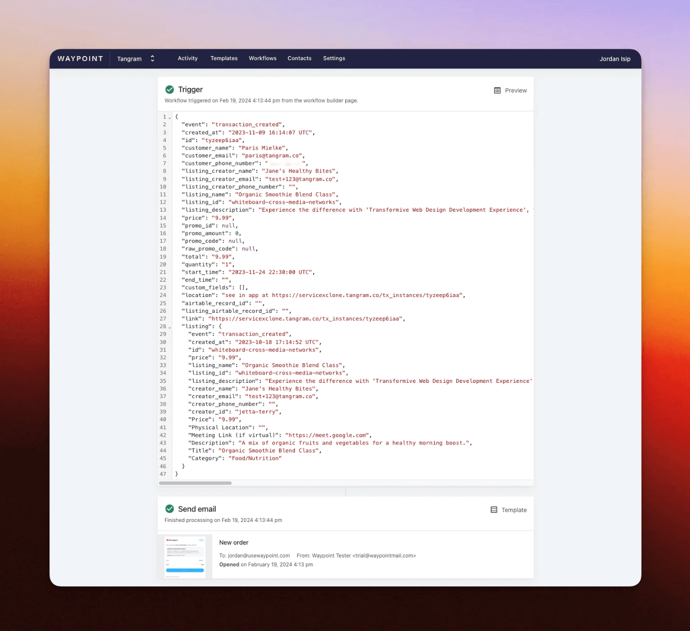 Since marketplaces are transactional by nature, emails are often the 'glue of UX' for marketplaces. While Tangram has a built-in set of email notifications, teams may want more flexibility around email design and sending. Luckily, this can easily be done by taking advantage of Tangram's built-in 'webhooks' and connecting them to Waypoint's transactional email platform.