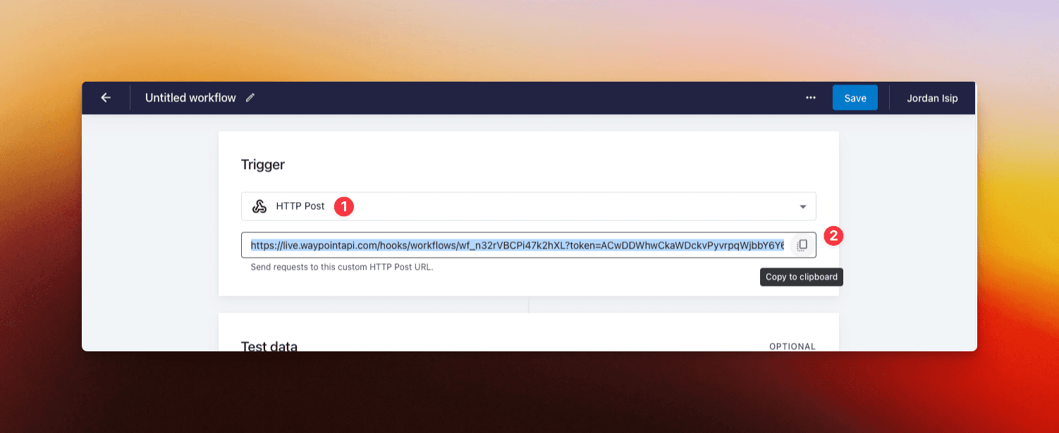 Before we can hook up dynamic data on the template, we want to see what kind of data we're working with from Tangram. To do this, we'll setup a URL that Tangram can send data to – we can do this with Waypoint's workflows.