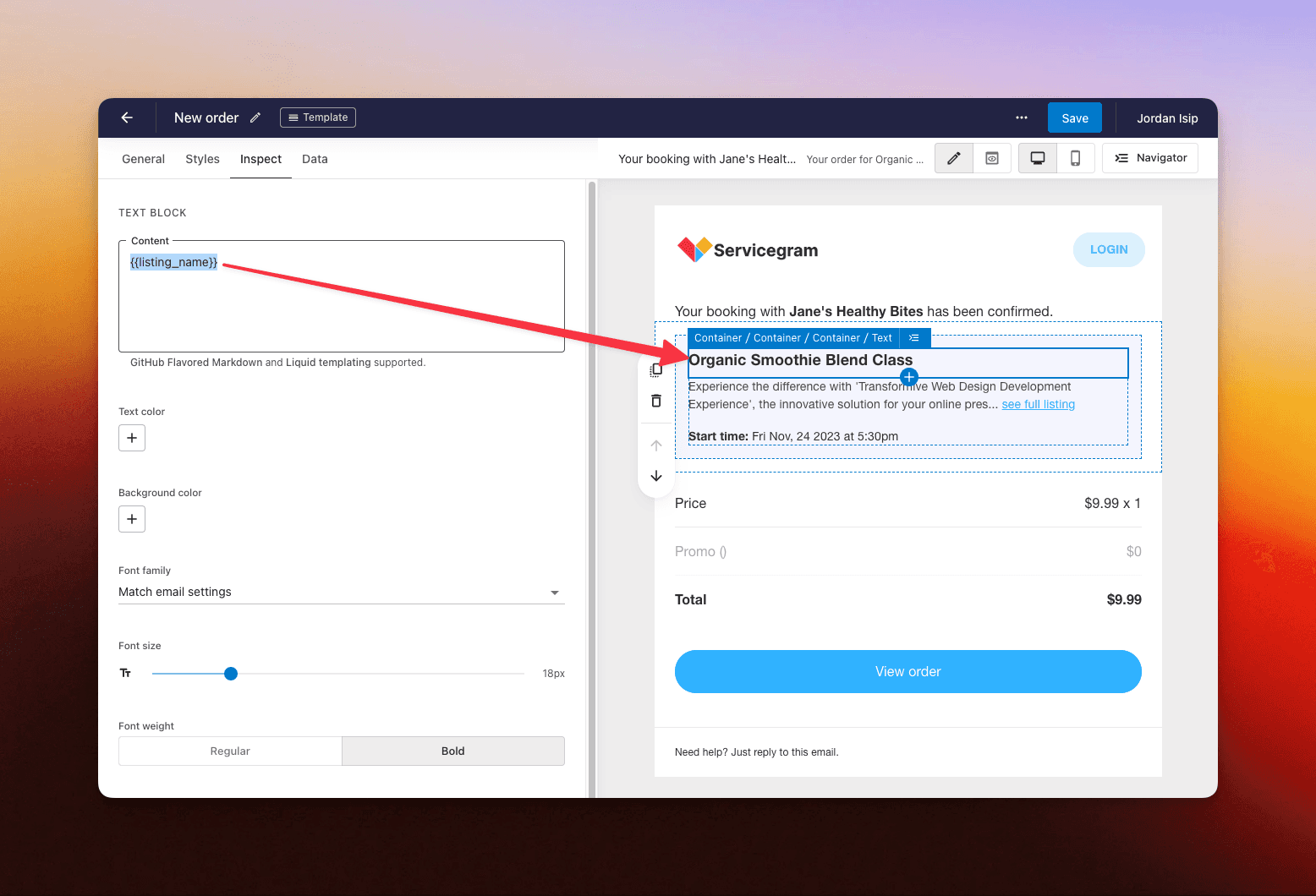 With the test data in place, we can now reference the data from the content blocks using LiquidJS templating (eg. {{listing_name}}) and see a live preview of the referenced variables.