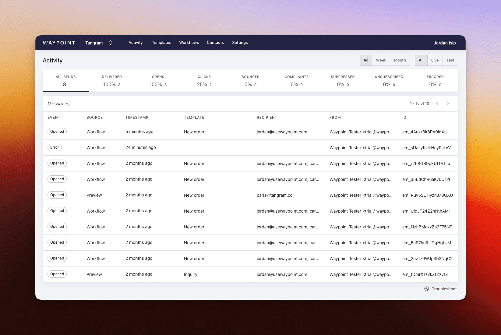 Additionally, we can monitor all of the sent emails and it's deliverability metrics from Waypoint's dashboard (learn more).