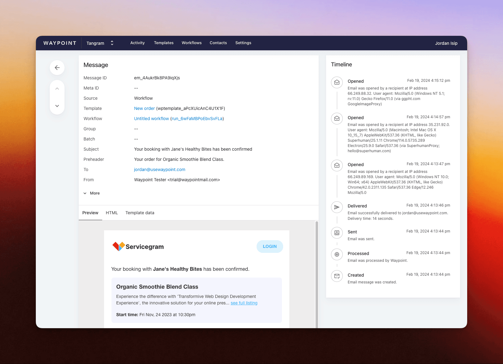From the Waypoint dashboard, we can also see a log of the message sent along with the preview, template data, metadata, and full timeline of delivery events.