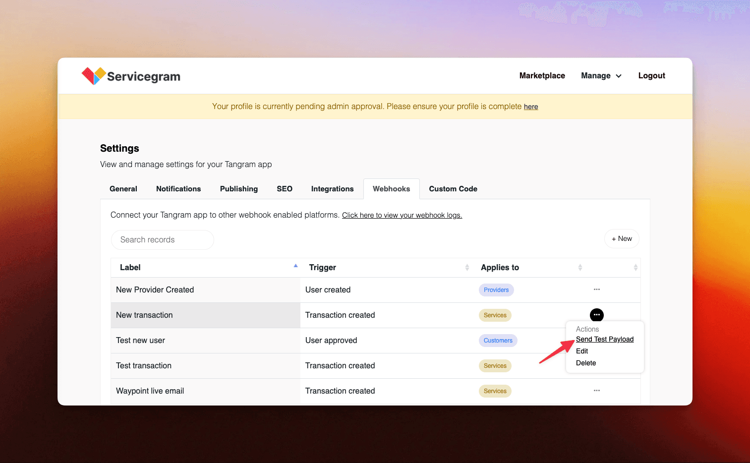 Now, let's go back to the Webhooks tab and on the row for our new webhook, click on the '…' button and then 'Send Test Payload'.