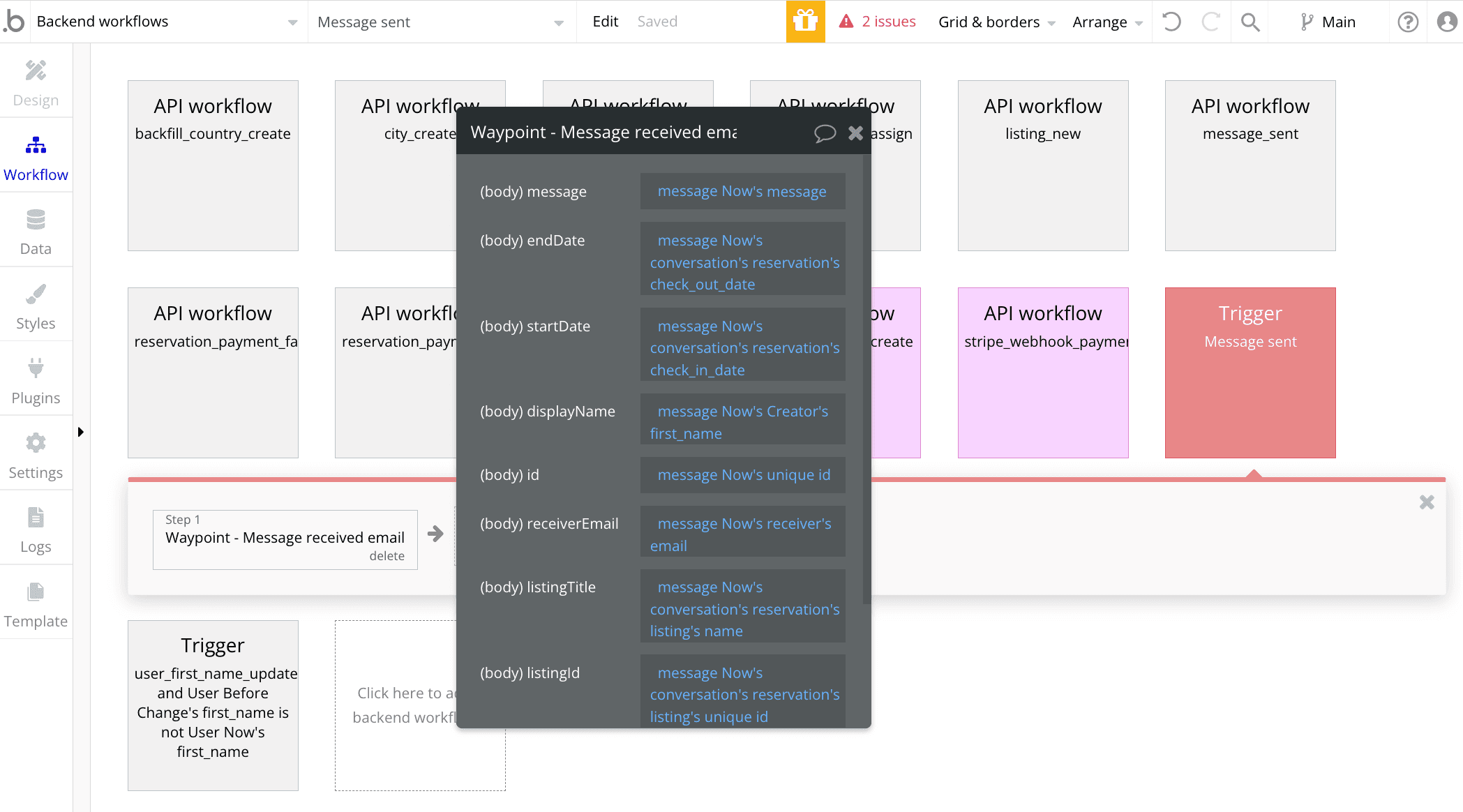 Everything should now be setup end-to-end 🎉. Now when a message is posted, a database trigger is fired which passes the associated data to the API call on Bubble, which passes the data to API call on Waypoint (via API connector plugin), which triggers the given dynamic template on Waypoint and delivers the email.