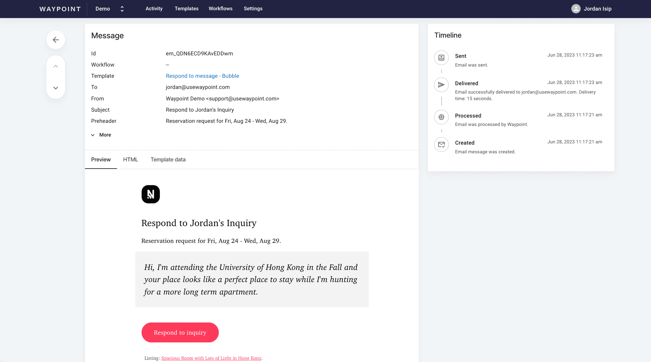 {{reservationRequest.displayName}}'s Inquiry”. We won’t get into the further details on how to build a template in this tutorial, but you can learn more about how to use Waypoint’s dynamic email templates.