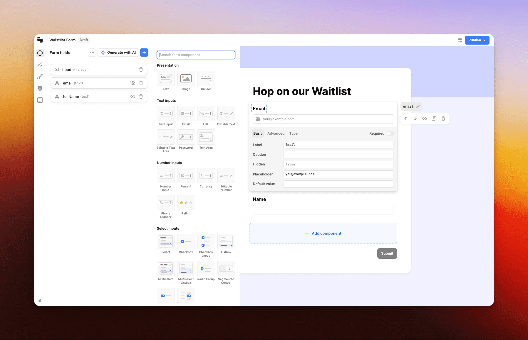 After adding the fields, click "Publish" to publish the form to a hosted page on Retool.