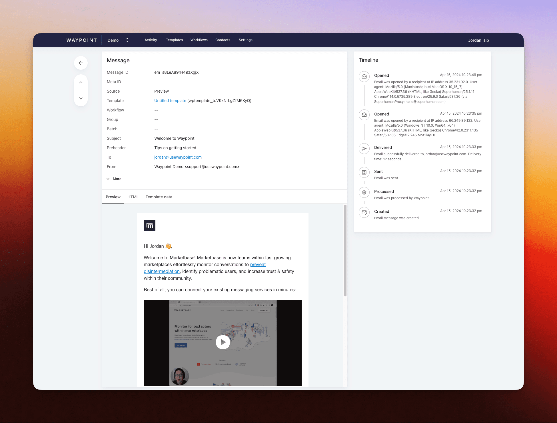 Additionally, the email log will be available on Waypoint to track the full raw email, all of the metadata, and the timeline of email events (opens, bounces, clicks, etc).