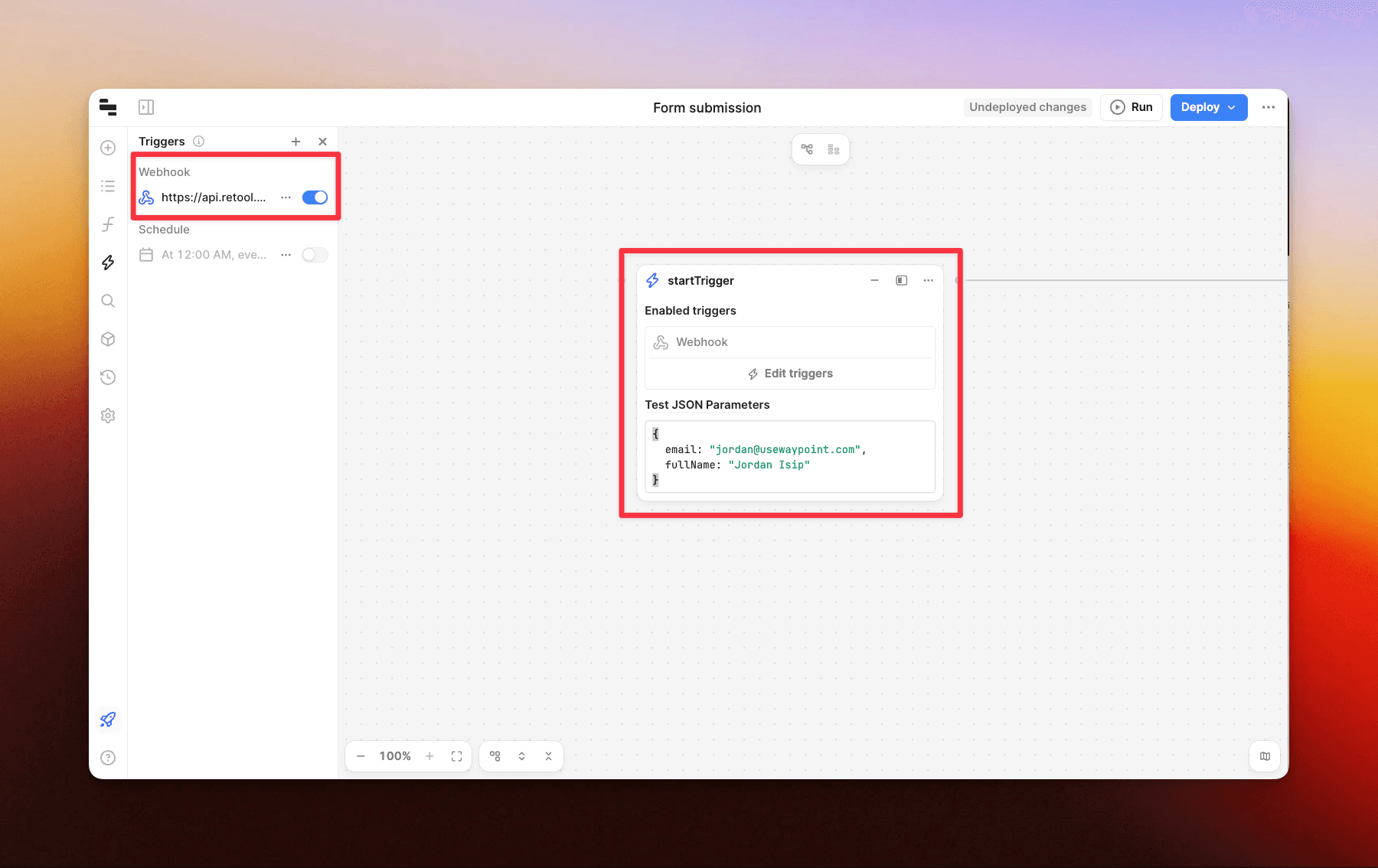 Modify the startTrigger to be a webhook (flip the switch) and then set the "Test JSON Parameters" to match the form field input fields that we setup in the previous step (email and fullName). This is the data that we'll expect to be passed in into the workflow (from the form). Example: