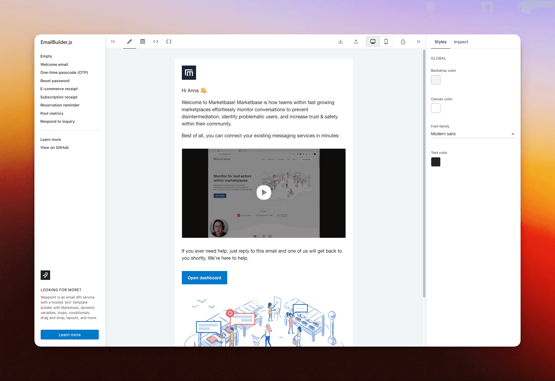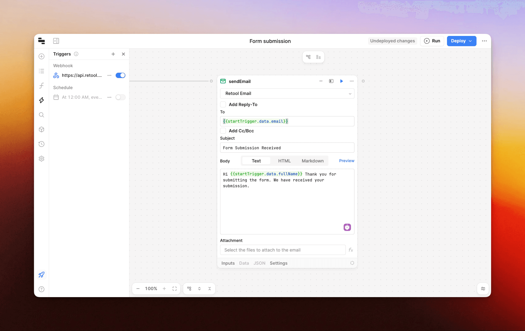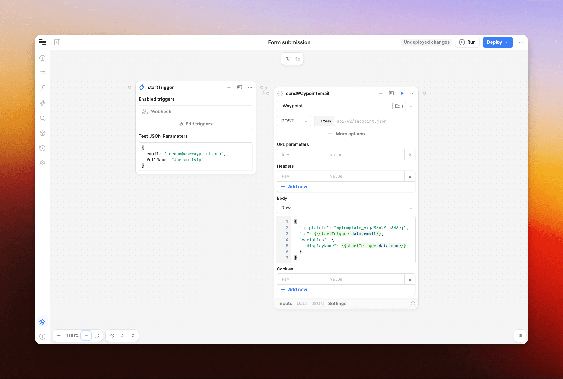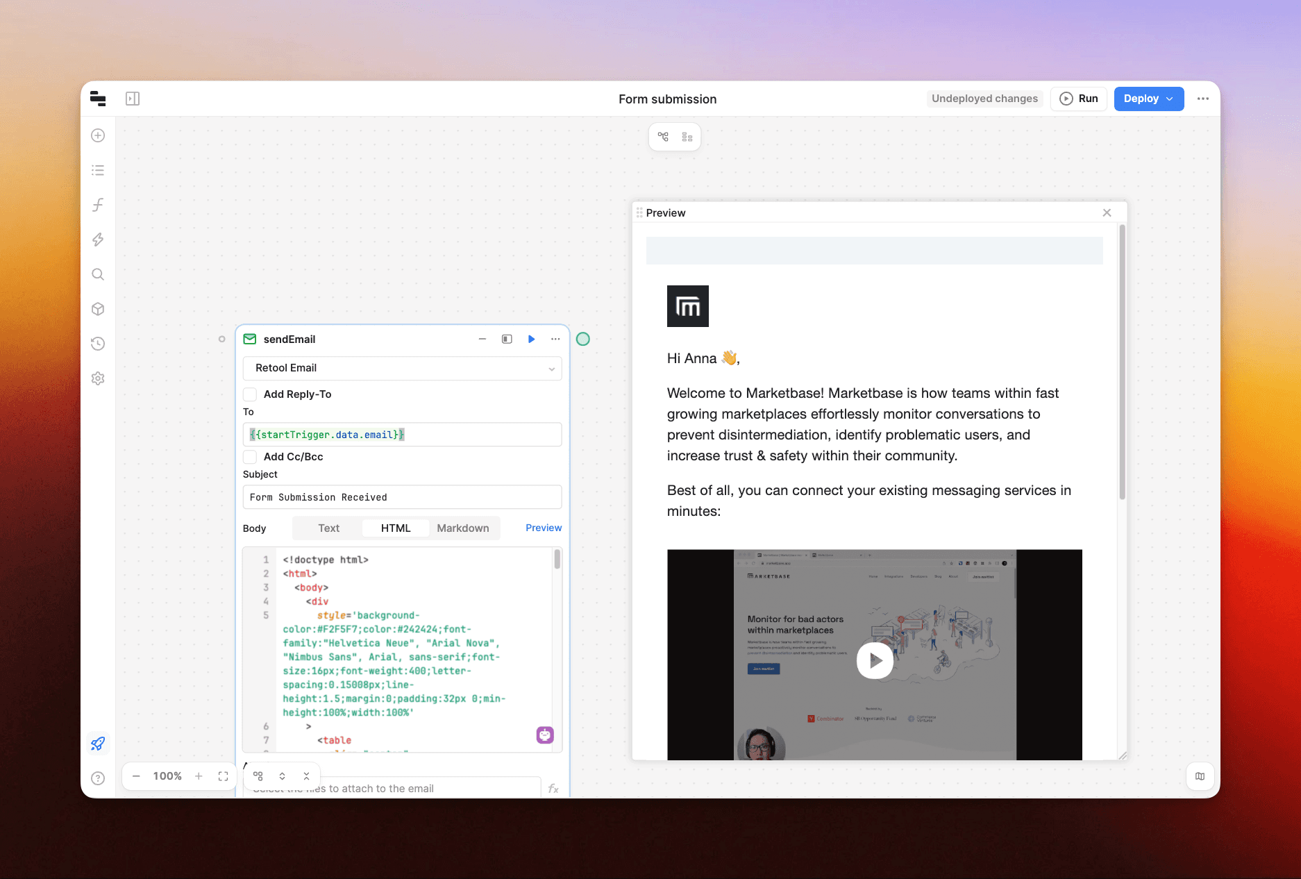 Retool's no-code platform is a fantastic way for teams to quickly spin up web forms to capture data from users. By pairing Retool Forms with Retool Workflows, teams can orchestrate user communication related to the form submissions. Teams can take email communication even further by passing form/workflow data to Waypoint's email API with a powerful template builder.