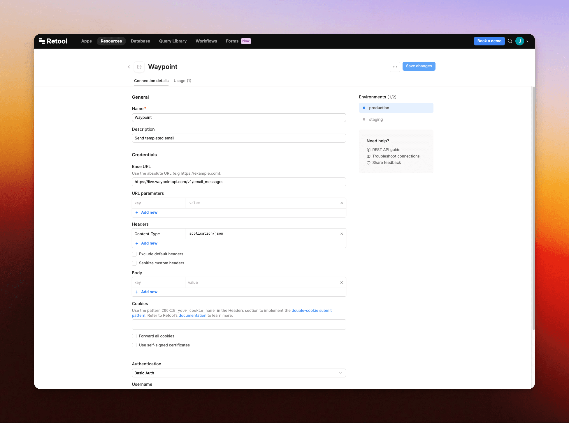 To setup Retool Workflows to pass data to Waypoint, we'll want to first create a new resource on Retool.