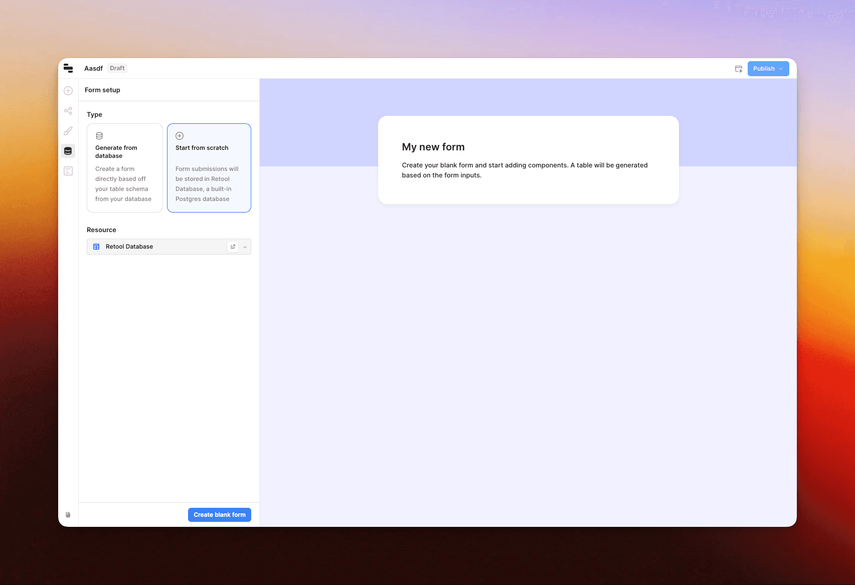 After creating a new form on Retool, we can use the 'Start from scratch' option to use the built-in Retool database to store our form submission data: